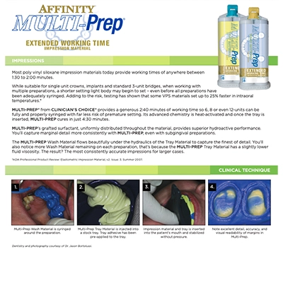 Multi-Prep is dentistry’s first extended working time impression material. Affinity™ Multi-Prep provides generous 2:40 minutes of working time. That’s enough time to fully syringe up to 12 units such as crowns, bridges and veneers without the risk of premature set. Once the tray is inserted, Multi-Prep cures in just 4:30 minutes.